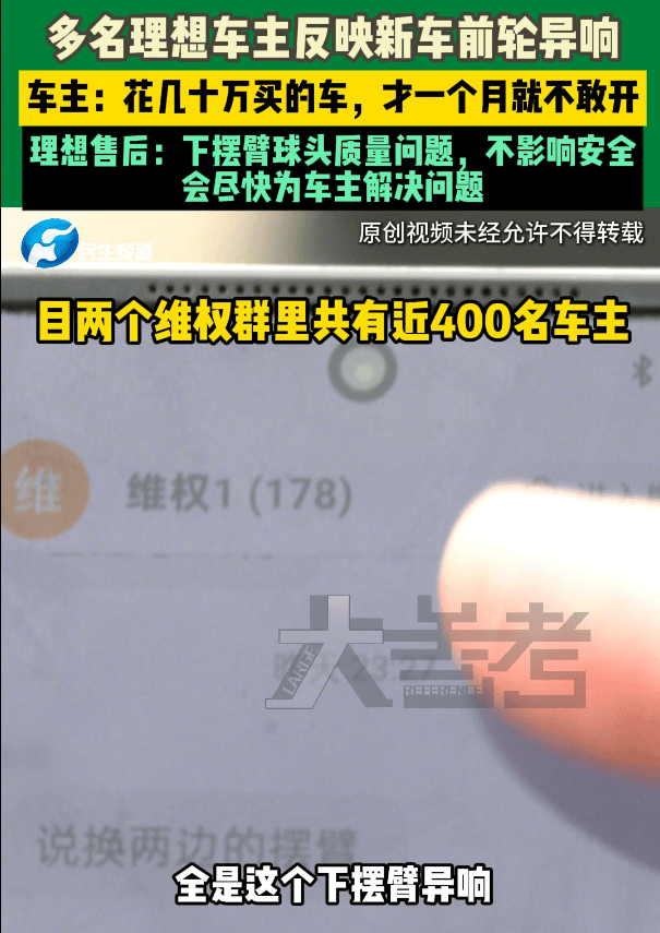 目前,两个“理想L系列焕新异响”维权群已聚集近400名车主,人数持续增加。理想售后承认问题源于下摆臂球头质量缺陷,承诺免费更换零件,但未提供补偿方案,引发车主强烈不满。